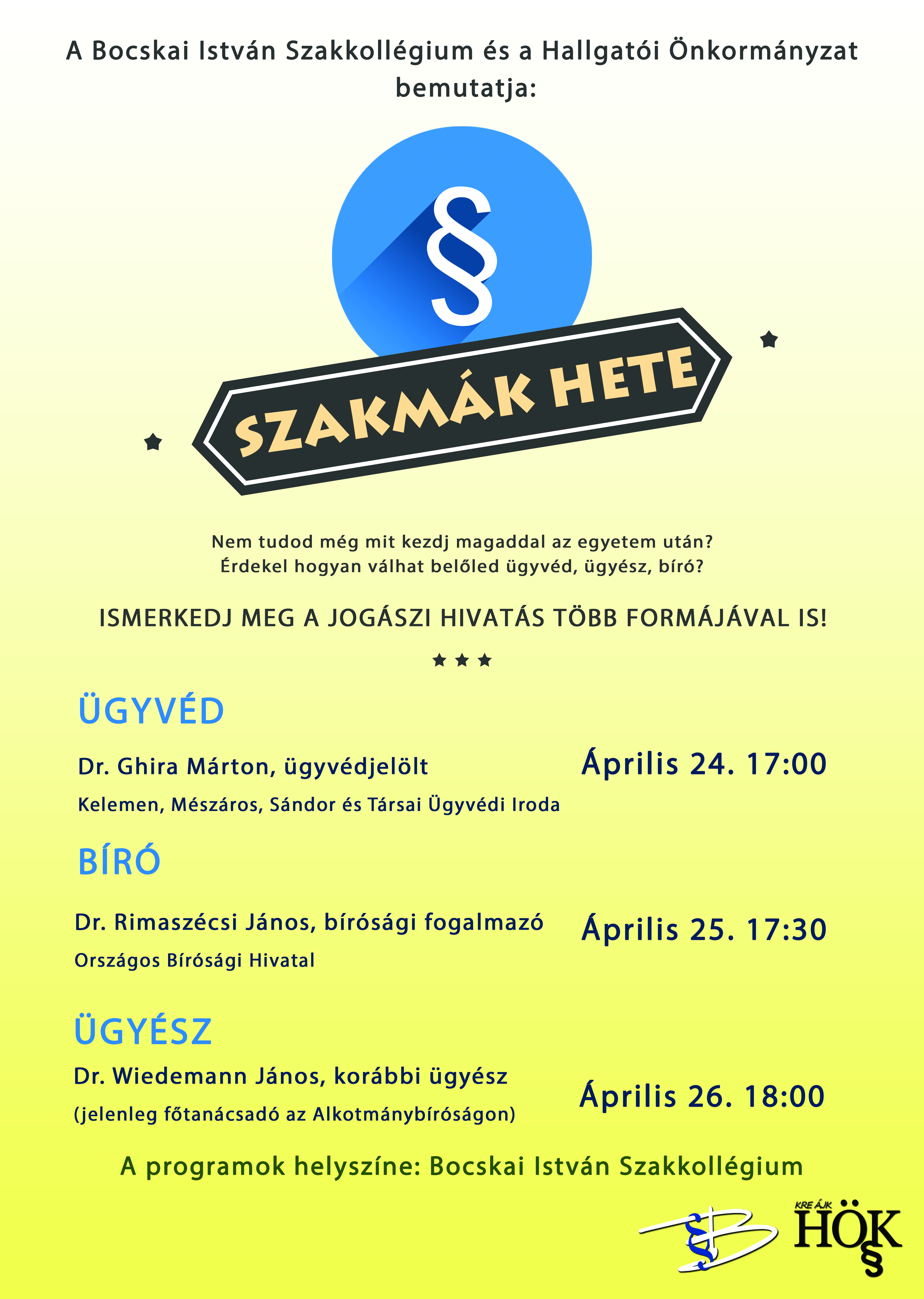 A Bocskai István Állam- és Jogtudományi Szakkollégium és a KRE ÁJK Hallgatói Önkormányzat szervezésében, április 24. és 26. között kerül sor a „Szakmák hete” elnevezésű előadássorozatra, ahol az érdeklődő hallgatók megismerkedhetnek 3 fő klasszikus jogászi hivatásformával.