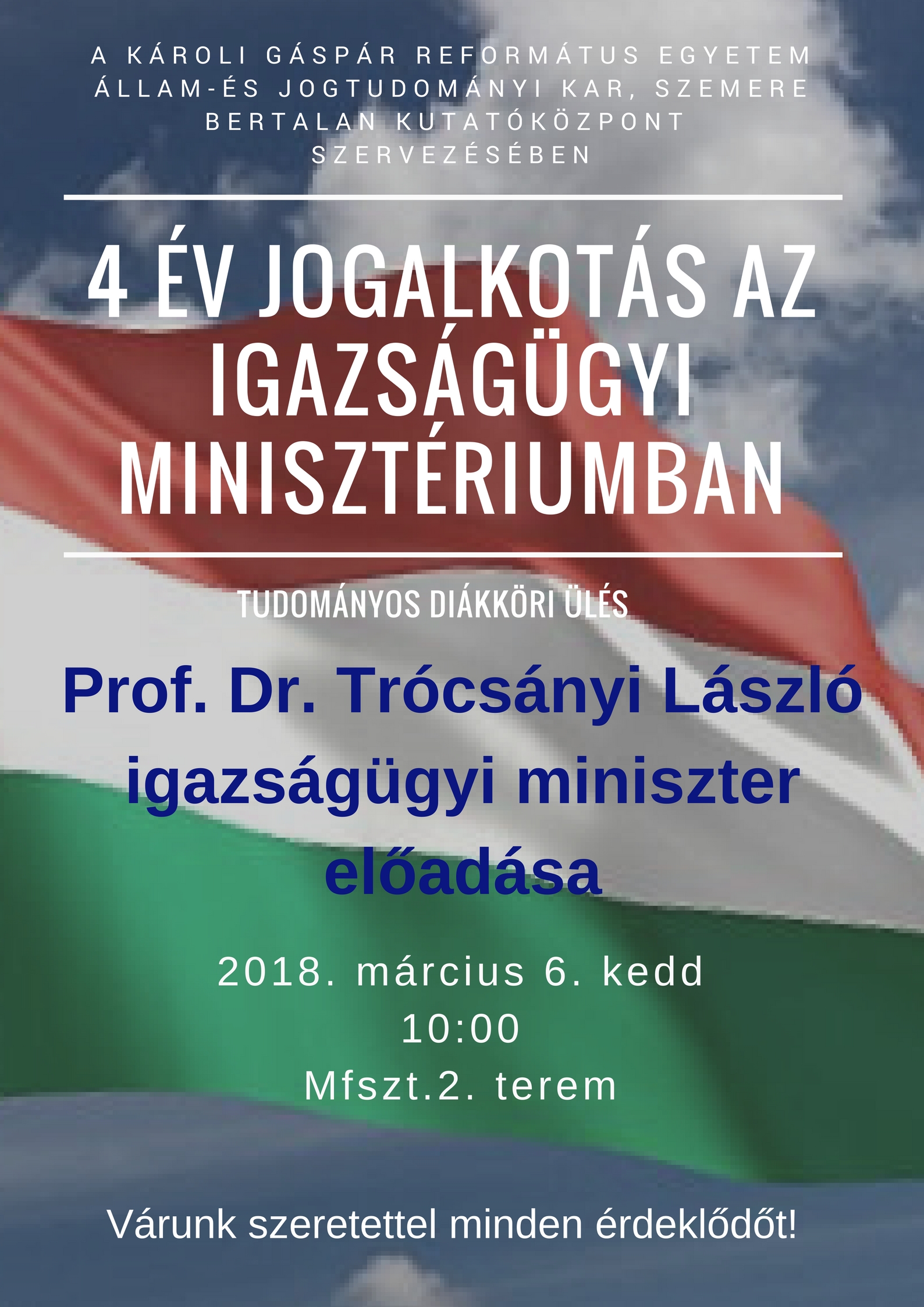 2018. március 6-án, kedden A Károli Gáspár Református Egyetem Állam- és Jogtudományi Kar, Szemere Bertalan Kutatóközpont szervezésében Prof. Dr. Trócsányi László, igazságügyi miniszter tudományos diákköri ülés keretében tartott előadást. Előadásának témája "4 év jogalkotás az Igazságügyi Minisztériumban" volt. A sikeres előadásról készült képek Galériánkban megtekinthetők.