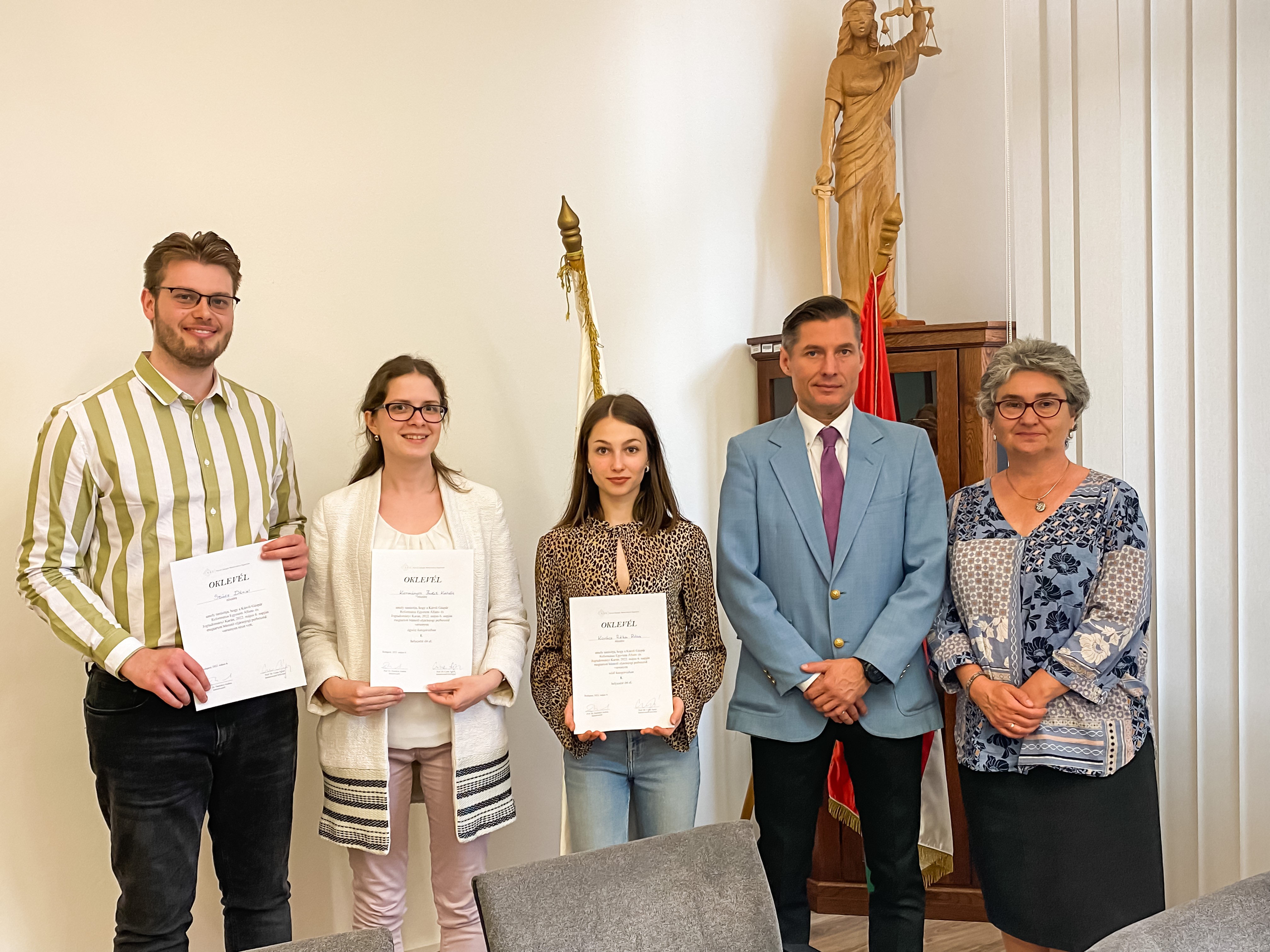 A Károli Gáspár Református Egyetem Állam- és Jogtudományi Kar Bűnügyi Tudományok Intézete szervezésében 2022. május 4-én zajlott a kari büntetőjogi perbeszédverseny. Az ügyészi kategória első helyezettje Kormányos Judit, az ügyvédi kategória első helyezettje Kovács Réka Róza voltak. A Prof. Dr. Czine Ágnes intézetvezető-helyettes és Prof. Dr. Domokos Andrea intézetvezető által kiállított emléklapot Dr. habil. Homicskó Árpád Olivér dékánhelyettes adta át a versenyzőknek 2022. május 17-én a kari tanácsteremben.