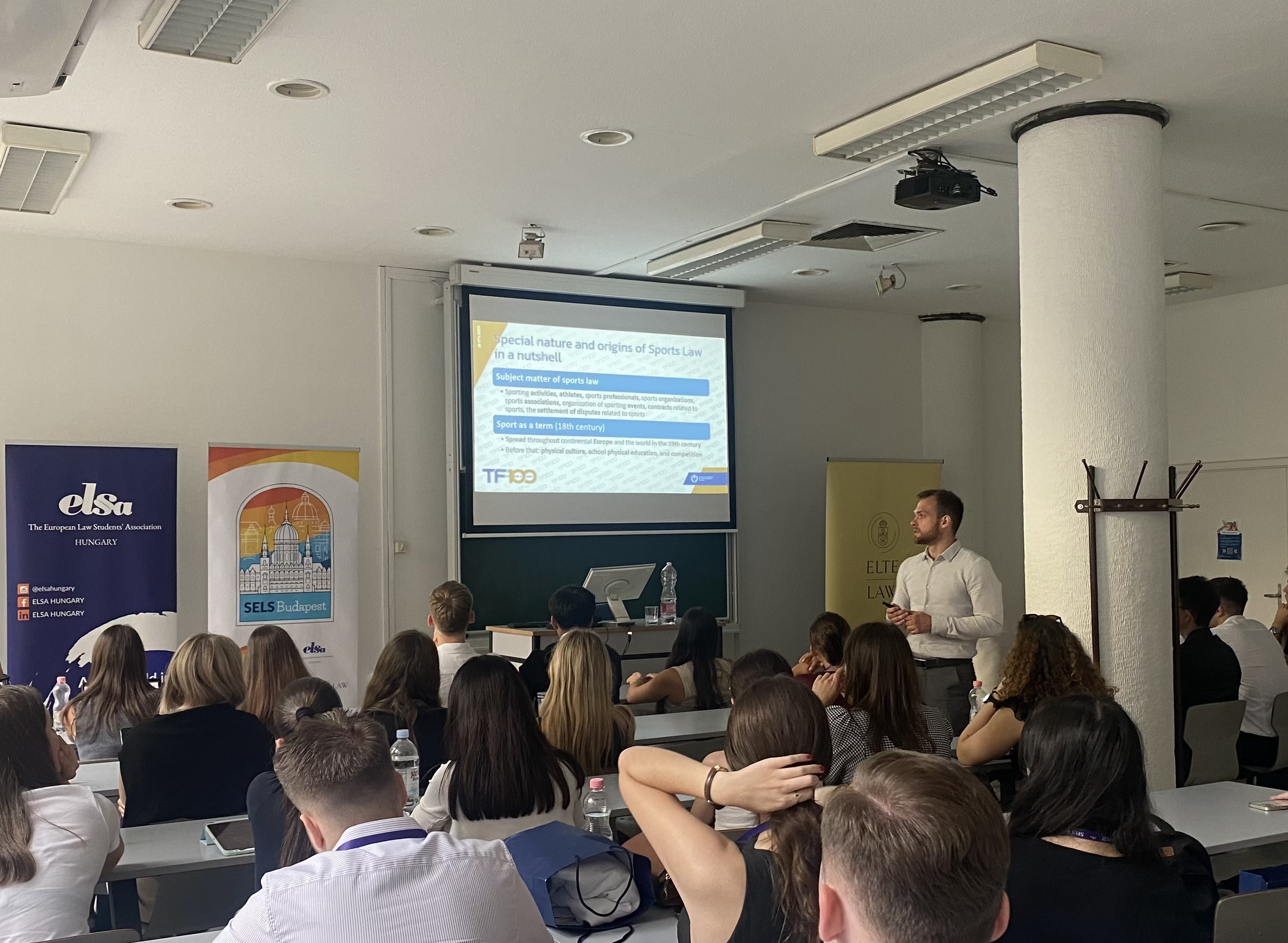 Az ELSA (European Law Students’ Association) magyarországi tagszervezete, az ELSA Hungary 2025. augusztus 17–24. között rendezte meg a „Summer ELSA Law School on Sports Law” című eseményt. Egyetemünk doktorandusza, dr. Székely Botond meghívott előadóként vett részt a programon. Dr. Székely Botond a saját PhD kutatási témájához kapcsolódó előadásában betekintést nyújtott a sportjog alkotmányjogi vonatkozásaiba, valamint a sport iránt érdeklődő utánpótlás-generáció figyelmét egyre inkább felkeltő új területbe: a játékosügynöki tevékenységbe. Az előadást követően a hallgatók élénk érdeklődést mutattak a játékosügynökök tevékenysége és a hivatásos labdarúgók átigazolásával kapcsolatos témakörök iránt.